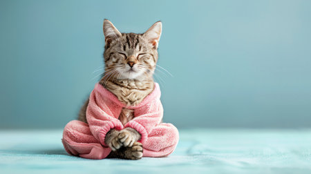 Cat meditating in pink outfit, light blue background, zen pose