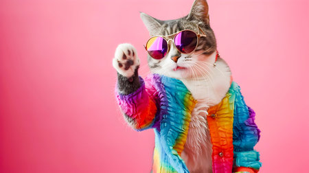 Playful and Energetic Cat Dances Happily in a Vibrant Colorful Fashion Outfit Complete with Stylish Sunglasses against a Colorful Studio Backdrop