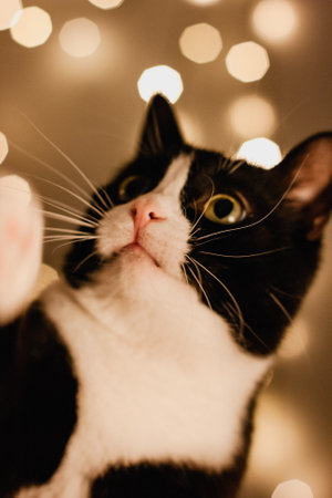 Christmas greeting card with a portrait of a black cat with a white neck sitting on a white table and looking at a Christmas tree ball. bokeh lights in the background.