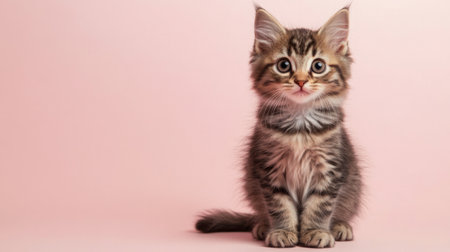 This adorable fluffy brown tabby kitten with striking markings sits gracefully against a soft pink background, showcasing its playful spirit and charm.
