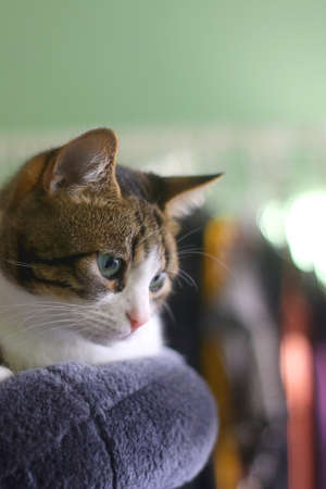 Portrait of a beautiful domestic cat lies in her bed near the window.