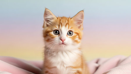 An orange tabby kitten with striking blue eyes is the subject of this close-up shot. The kitten is situated on a soft, pink blanket, with a blurred background of pastel colors. The lighting is soft and even, highlighting the textures. Suitable for various projects like pet-related websites or marketing materials.