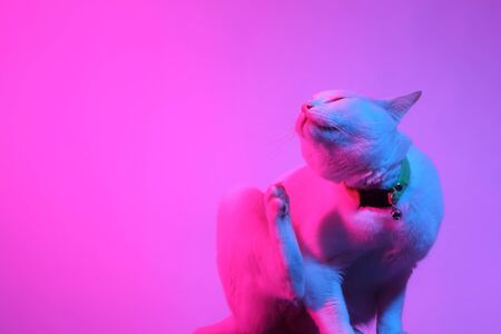 The white cat in the color gel light,