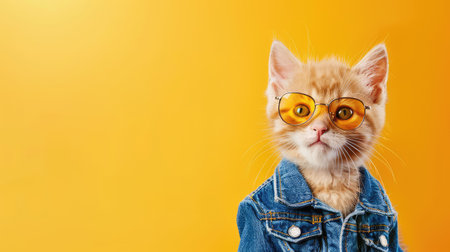 This charming orange kitten sports stylish sunglasses and a denim jacket, creating a playful and cool look against a bright yellow background.