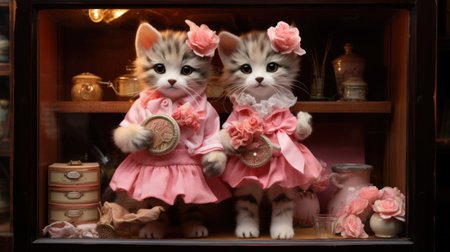 Two small kittens dressed in pink holding a clock and flowers, AI