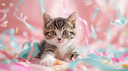 A kitten is laying on a pink blanket with confetti, AI