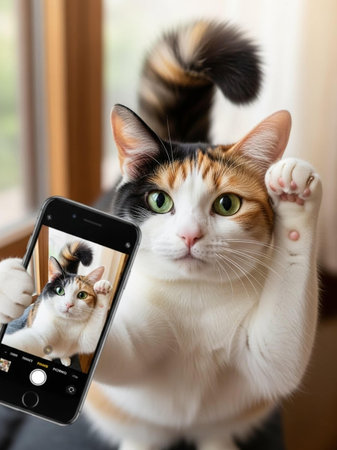 A curious calico cat taking a selfie with a smartphone indoors