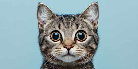 Charming Tabby Cat Sitting Gracefully Against a Soft Pale Cyan Background, Captivating Expression