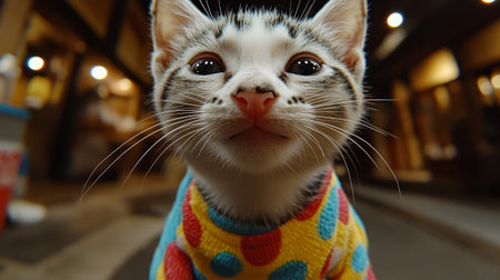 A playful kitten dressed in colorful polka dots explores a cozy indoor space filled with warm light.