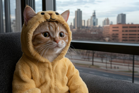 Cat in a hoodie with starry background, whimsical portrait. Cute and cozy pet concept