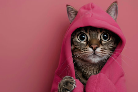 A cat dressed in a pink sweater with a hoodie, looking cozy and stylish.