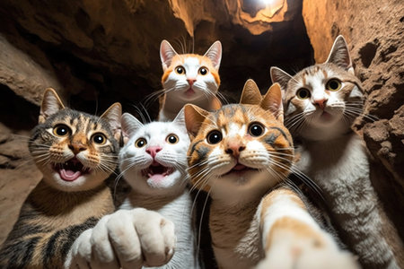 Group of Curious Cats Forming a Circle and Looking Down at the Viewer. Fun Cat Meme, Wake Up!