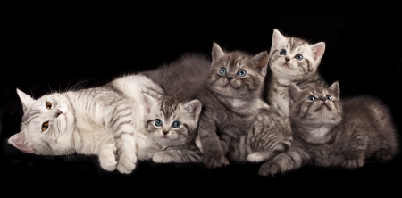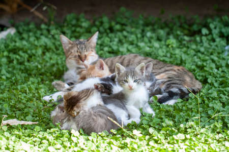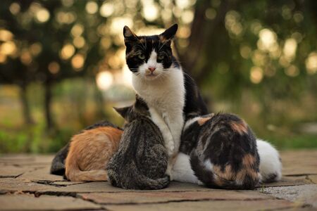 maneki neko tricolor cat and her small kittens, family portrait outdoor, relaxation domestic animals.