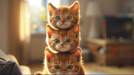 Three Adorable Ginger Kittens Playfully Stacked Together in Sunlit Living Room