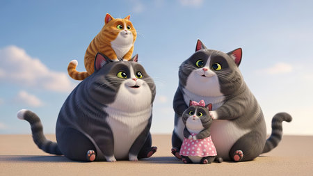 Four cartoon cats are depicted in a bright outdoor setting against a clear blue sky. The scene is brightly lit, showcasing detailed textures and a friendly, stylized appearance. This image would be suitable for various commercial applications, including illustrations, marketing materials, and educational content.