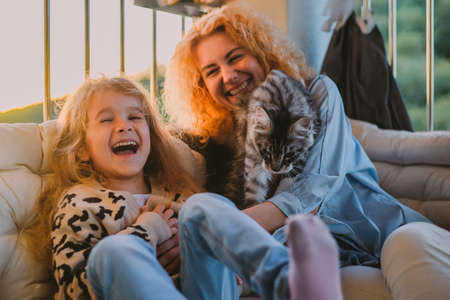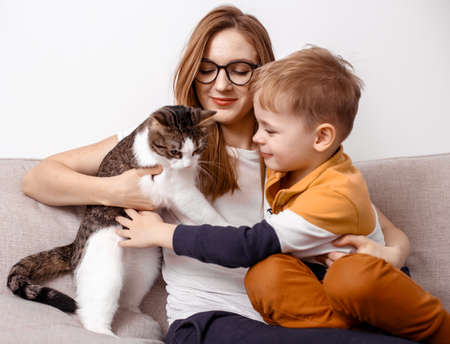 Mommy, son and cat sits on the couch in the home interior. Concept inferior family, no father, modern woman. A happy family, mother, son and cat are sitting on the sofa feeling happy.