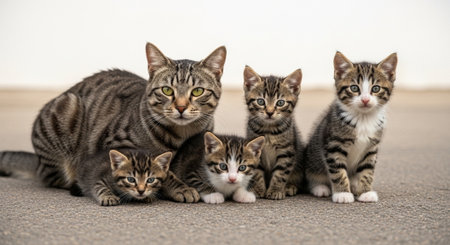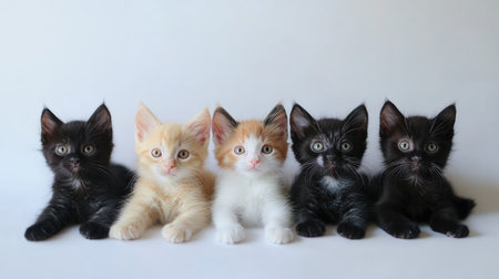 Five adorable kittens pose together, showcasing their playful and charming personalities. Perfect for animal lovers, this image captures youthful joy and companionship.