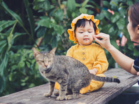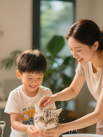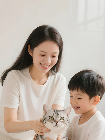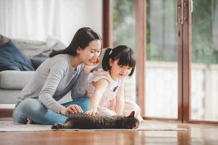 Happy Asian family mother and daughter palying with cat at home in living room. Focused on mother