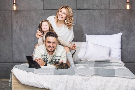 Family father, mother and sweet daughter happy together with little fluffy kittens on the bed in the bedroom in the home interior
