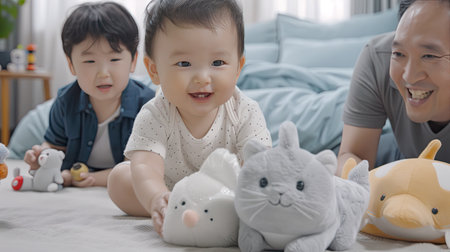A smiling baby plays with stuffed animals on a couch while a grandfather watches with a smile.