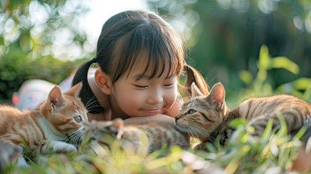 Happy girl and lovely pet cats are playing together in the living room, AI Generated.