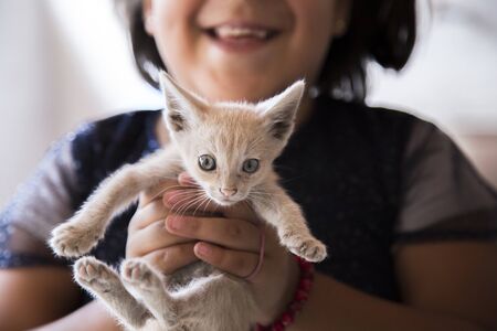 Cute little smiling girl with hugs cute warm striped cat. Lovely domestic pet.