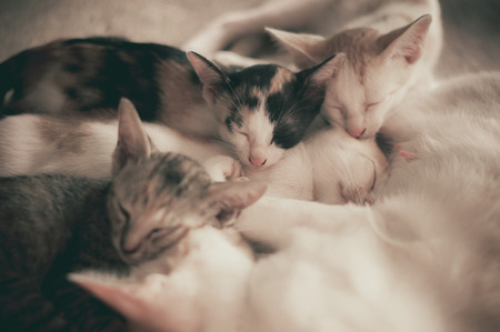 animal shelter, with group of cats snuggled together on bed, created with generative ai