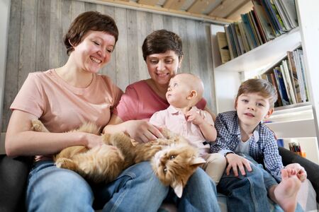 A young lesbian same-sex family with two children, a son and a daughter spend time at home. They sit on the couch and read a book. The pet cat is lying next to it. Homosexual couple marriage.