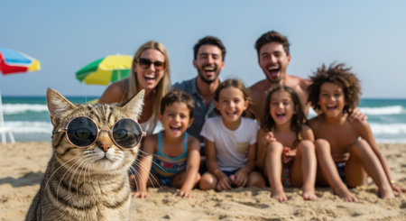 cats portrait with sunglasses, Funny animals in a group together looking at the camera, wearing clothes, having fun together, taking a selfie, An unusual moment full of fun and fashion consciousness