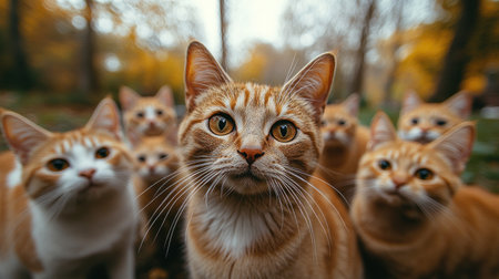 A group of curious tabby cats explores a wooded area filled with autumn foliage.