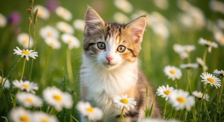 A tabby kitten sits amidst a field of white daisies and green grass. The image displays a shallow depth of field, with soft sunlight illuminating the scene. Suitable for a variety of uses, including illustrations, advertising materials, and editorial content relating to nature and pets.