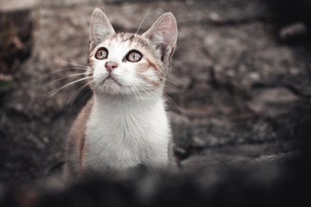 Close up of a cute kitten with captivating eyes gazing upwards, its delicate features and soft fur highlighted by warm lighting, creating a heartwarming scene of innocent curiosity