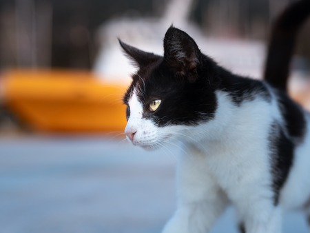 Portrait of an angry black and white cat walking