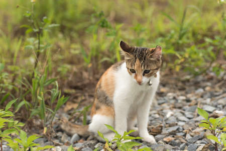 Beautiful cat sitting on the floor in the garden. Selective focus.