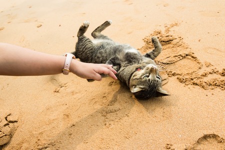 Playing with a cat on the beach in Thailand