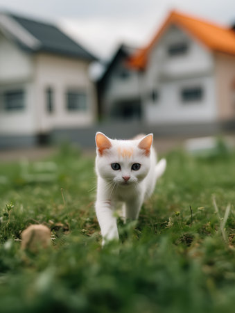 White kitten lies on the grass, sunny day in the garden, pets relax and play