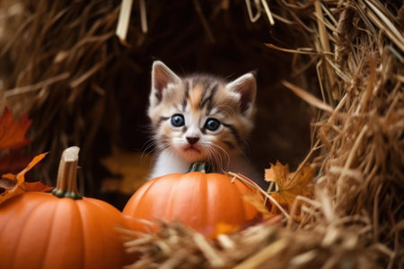 A kitten peeking out from behind a pile of pumpkins. Generative AI image.