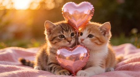 Charming digital artwork with soft-focus foreground composition and warm romantic sunset lighting, evoking an affectionate, sweet mood. Perfect for Valentine's Day cards, pet-themed merchandise, social media graphics, and romantic branding materials. Versatile for animal lovers in advertising, publishing, and e-commerce designs. . AI-generated digital illustration. AI-generated illustration.