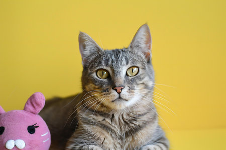 Portrait of a tabby cat with a toy on a yellow background