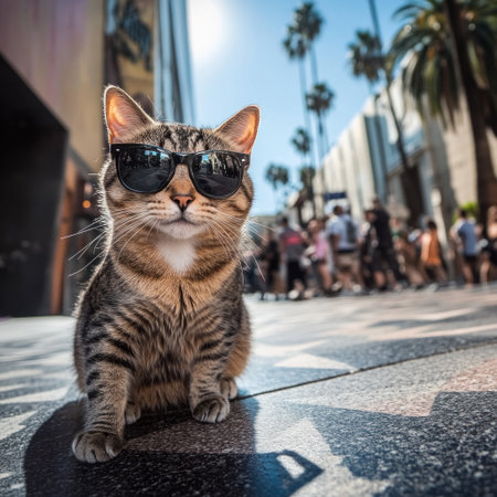 A cat wearing sunglasses posing on the Hollywood Walk of Fame, looking at the camera, wide-angle shot, street photography, high resolution, f/20, 58mm lens, natural lighting, shallow depth of field, raw photo, full-body portrait, ultra-realistic, super-detailed, no grainy textures, sharp focus, Nikon D750. --v 6.1 Job ID: e7c7c375-1b82-4d03-9f49-8fcffb684af0