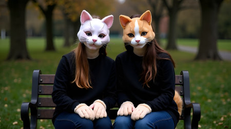 Two young women sitting on a bench in the park with a cat
