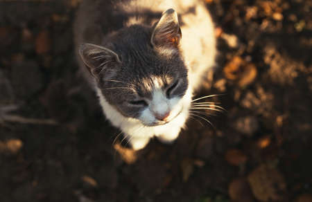 Adorable grey and white cat outdoor close up. Top view.
