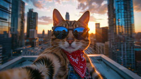 A cool cat wearing sunglasses and a bandana takes a selfie on a rooftop at sunset, with city skyscrapers in the background.