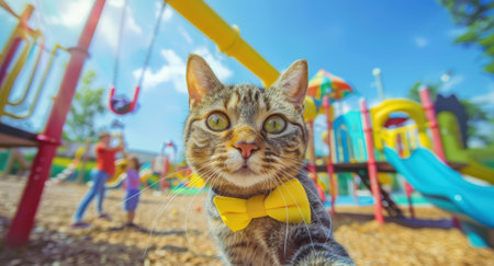 A playful cat wearing a yellow bow tie takes a selfie in a vibrant playground, with children playing in the background.