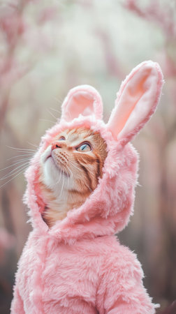 Cat in pink bunny costume looking upwards, cute and whimsical concept