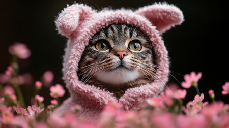 Cat in pink bunny costume with soft fur and curious expression