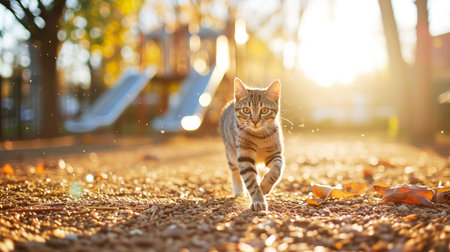 Cute cat playing on the grassy lawn at sunset