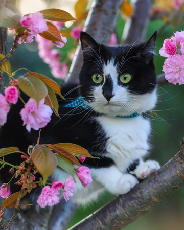 Green-eyed cat among pink cherry blossoms