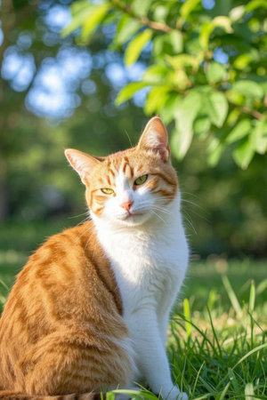 Yellow and white cat on the grass