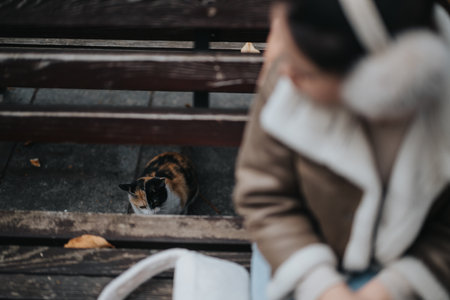 Woman on a wooden bench observing a cute cat nearby outdoors